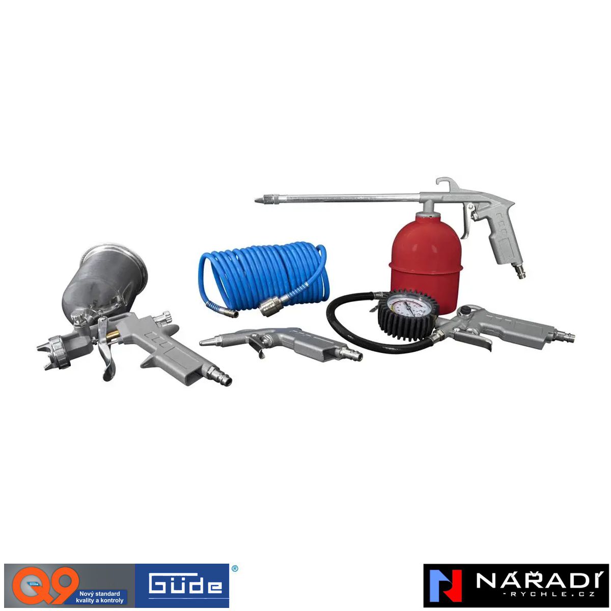 Praktická 5-dílná sada pneumatického nářadí Güde je ideální pro běžné údržbářské a lakýrnické práce v garáži, dílně nebo na chalupě. Díky široké škále použití umožňuje nanášení barev a ochranných hmot, huštění pneumatik i ofukování nečistot stlačeným vzduchem.