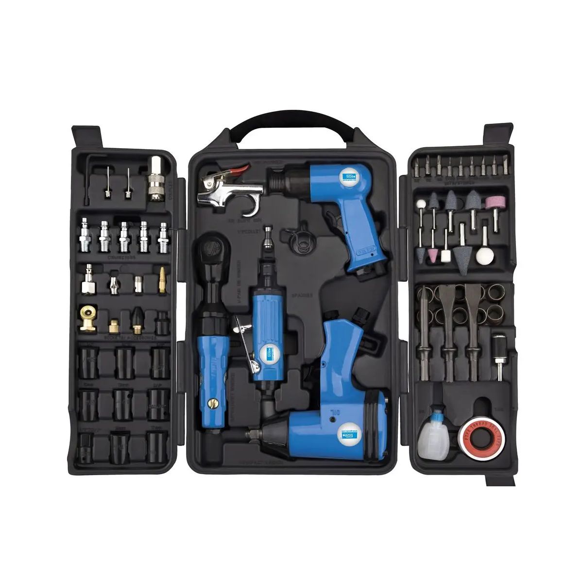 Sada pneumatického nářadí Güde, 71dílná, je univerzální a praktická výbava pro každou dílnu, garáž nebo servis. Obsahuje vše potřebné pro širokou škálu prací – od výměny kol přes sekací práce až po jemné broušení. V sadě najdete čtyři základní pneumatické nástroje: rázový utahovák, ráčnový šroubovák, sekací kladivo a přímou brusku, spolu s bohatým příslušenstvím a potřebnými konektory. Ideální volba pro všechny, kdo hledají kompletní pneu sadu v jednom balení.