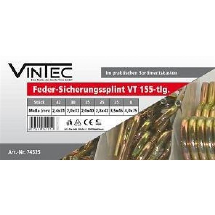 Sada 155 kusů pérových pojistných závlaček Vintec obsahuje široký výběr velikostí pro bezpečné jištění spojovacích prvků proti samovolnému uvolnění. Odolná konstrukce a univerzální využití dělají z této sady nezbytný doplněk pro každou dílnu, garáž nebo profesionální provoz.